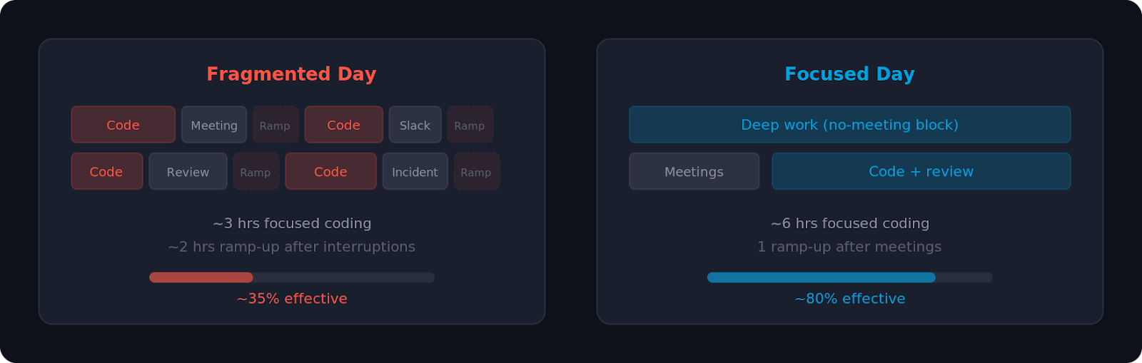 The organizational fixes are straightforward, even if they require discipline: minimize meetings during core coding hours, protect "no-meeting blocks" where developers can focus, and be intentional about which communication is synchronous (real-time, interrupting) versus asynchronous (batched, non-interrupting).